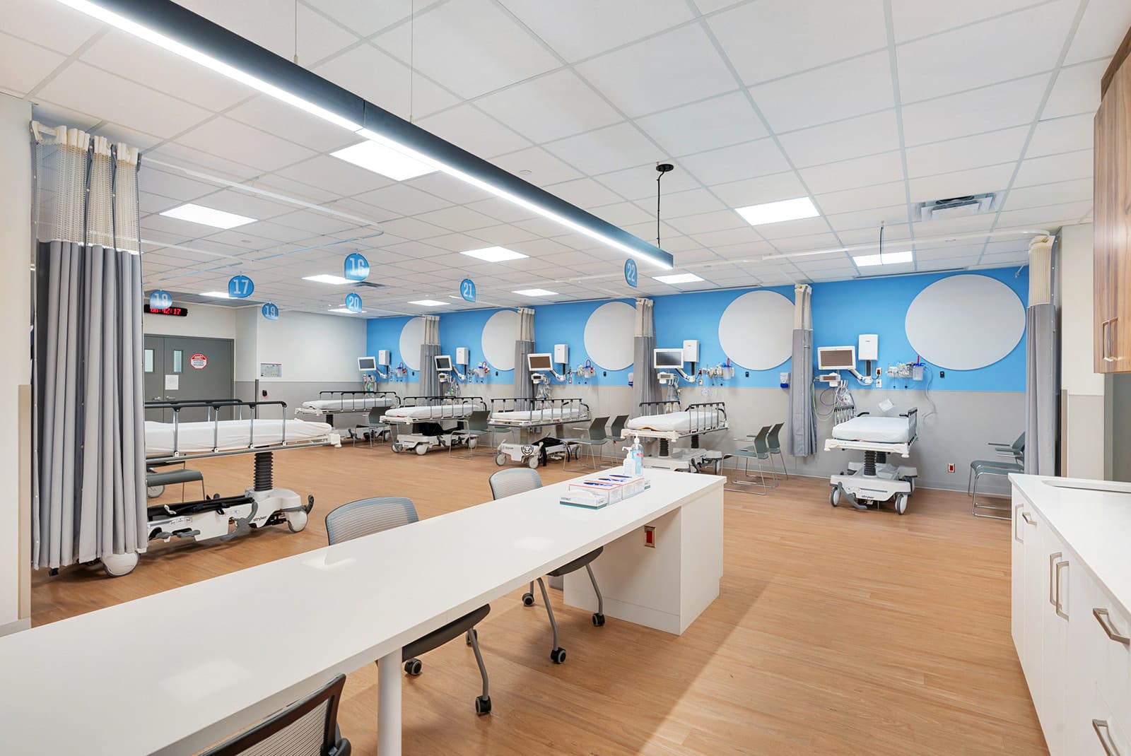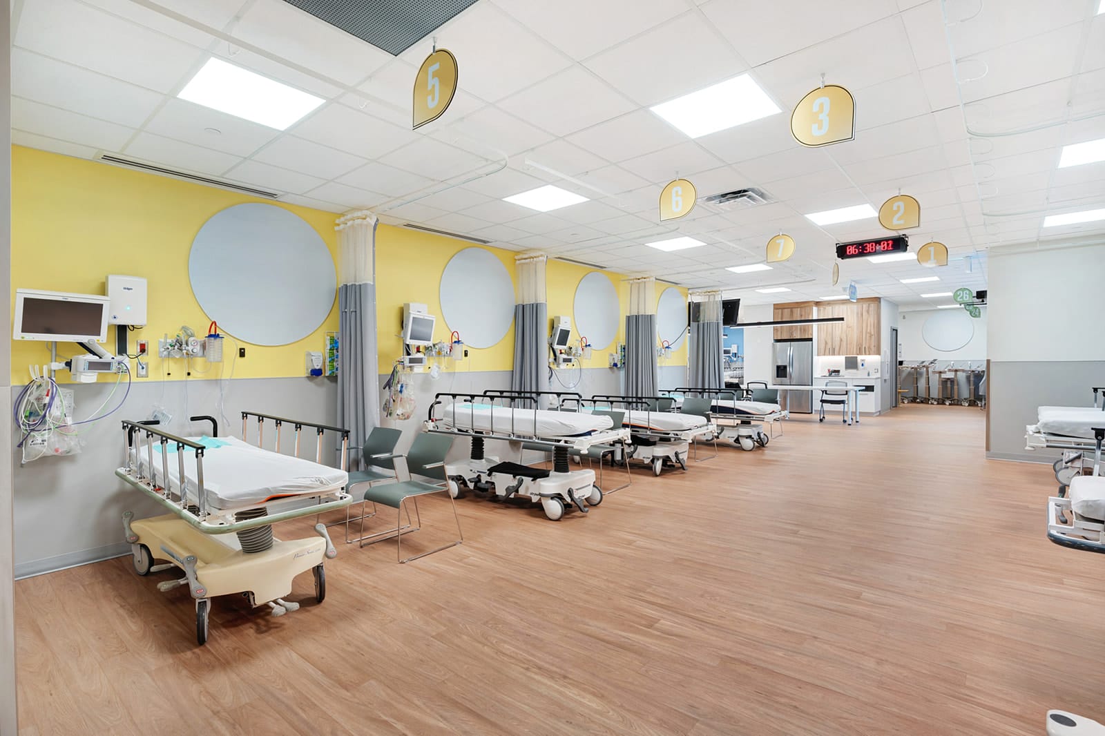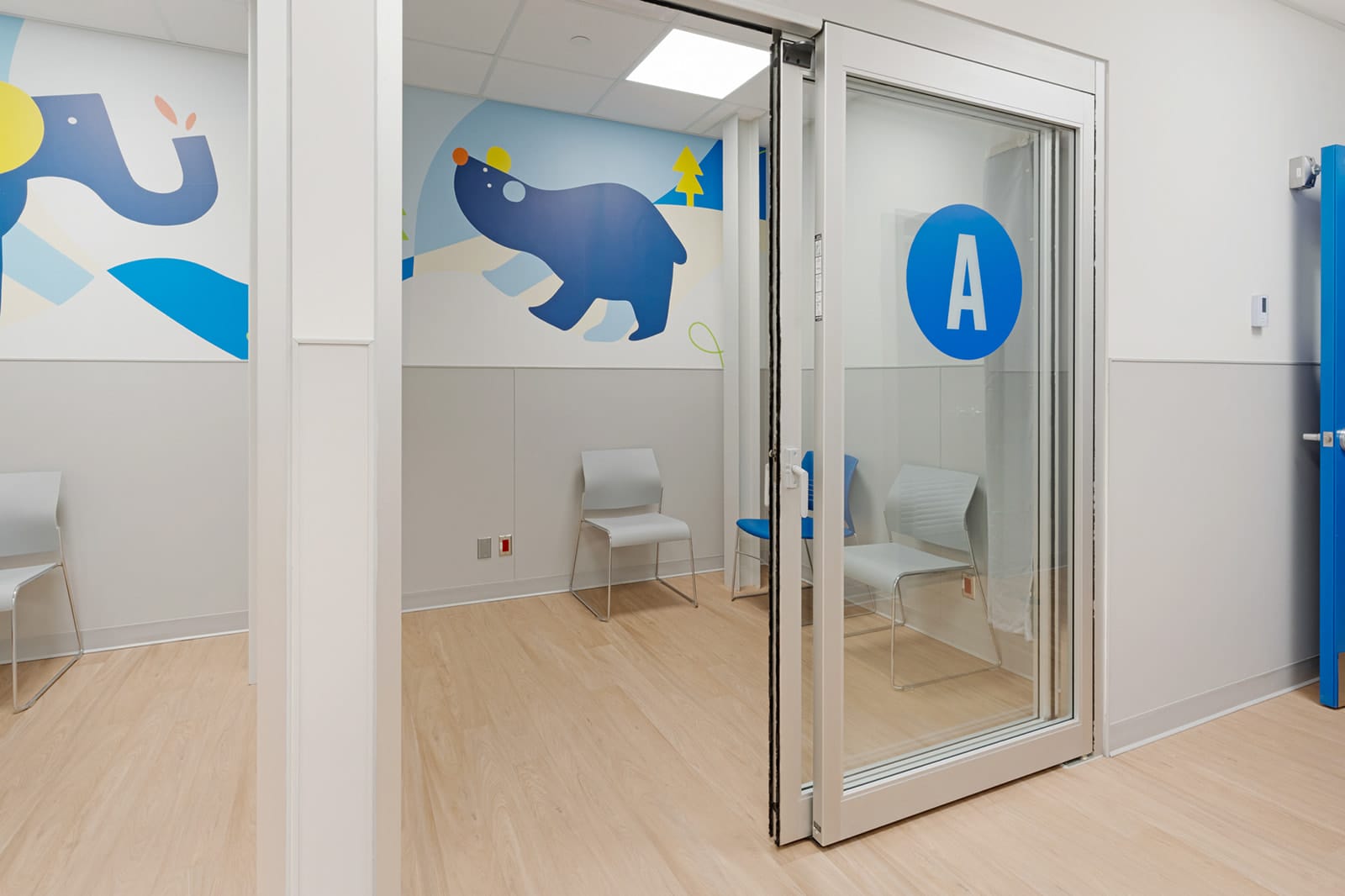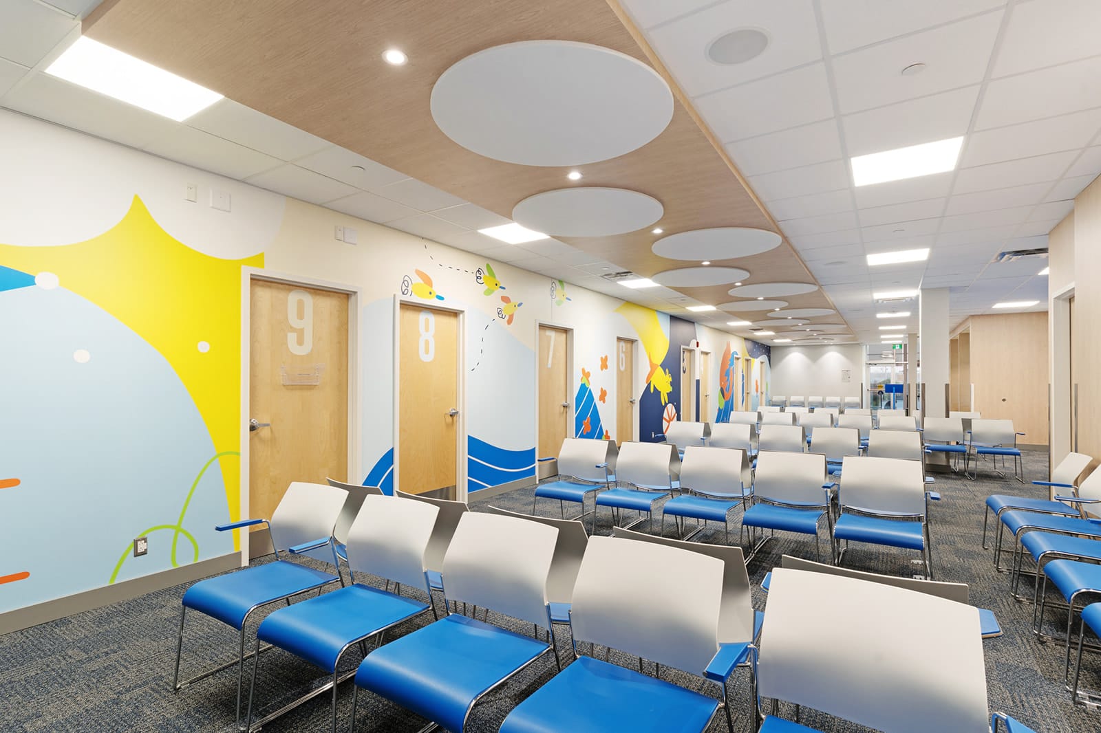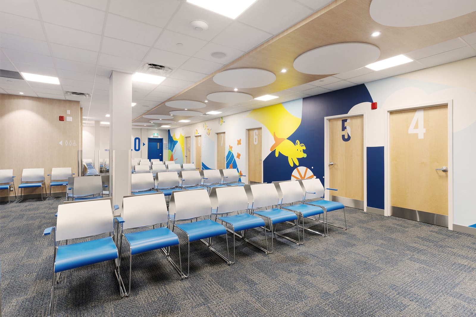 La clinique ayant une vocation pédiatrique, nous avions pour mission de créer un lieu ludique destinée aux enfants – sans toutefois oublier que la clinique accueille également le personnel et les parents.